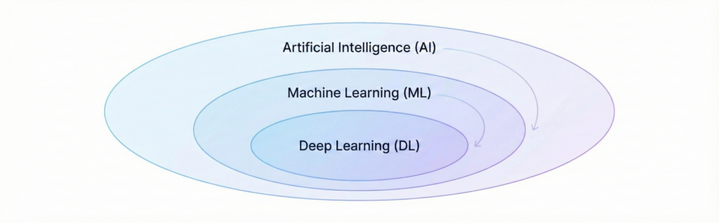 - Deep Learning (DL): A subfield of ML that uses neural networks with multiple layers to learn complex patterns from large amounts of data.